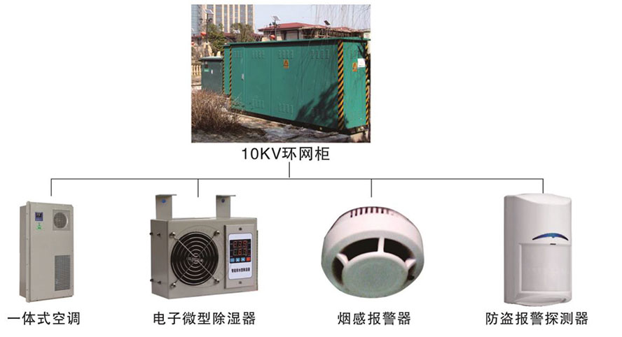 環(huán)網(wǎng)柜制冷濕管理系統(tǒng)主要由一體式空調(diào)(定制)、電子式微型除濕器,防盜煙感報(bào)警、煙霧探測(cè)器四個(gè)部分組成,所有設(shè)備均有安裝在環(huán)網(wǎng)柜內(nèi)部,實(shí)現(xiàn)環(huán)網(wǎng)柜的溫度測(cè)量控制。每套環(huán)網(wǎng)柜除濕管理系統(tǒng)包含一體式空調(diào)1套,電子式微型除濕器2臺(tái),防盜煙感器1只,煙霧傳感器1只;經(jīng)過(guò)改造后的系統(tǒng)組成示意圖如下圖所示: